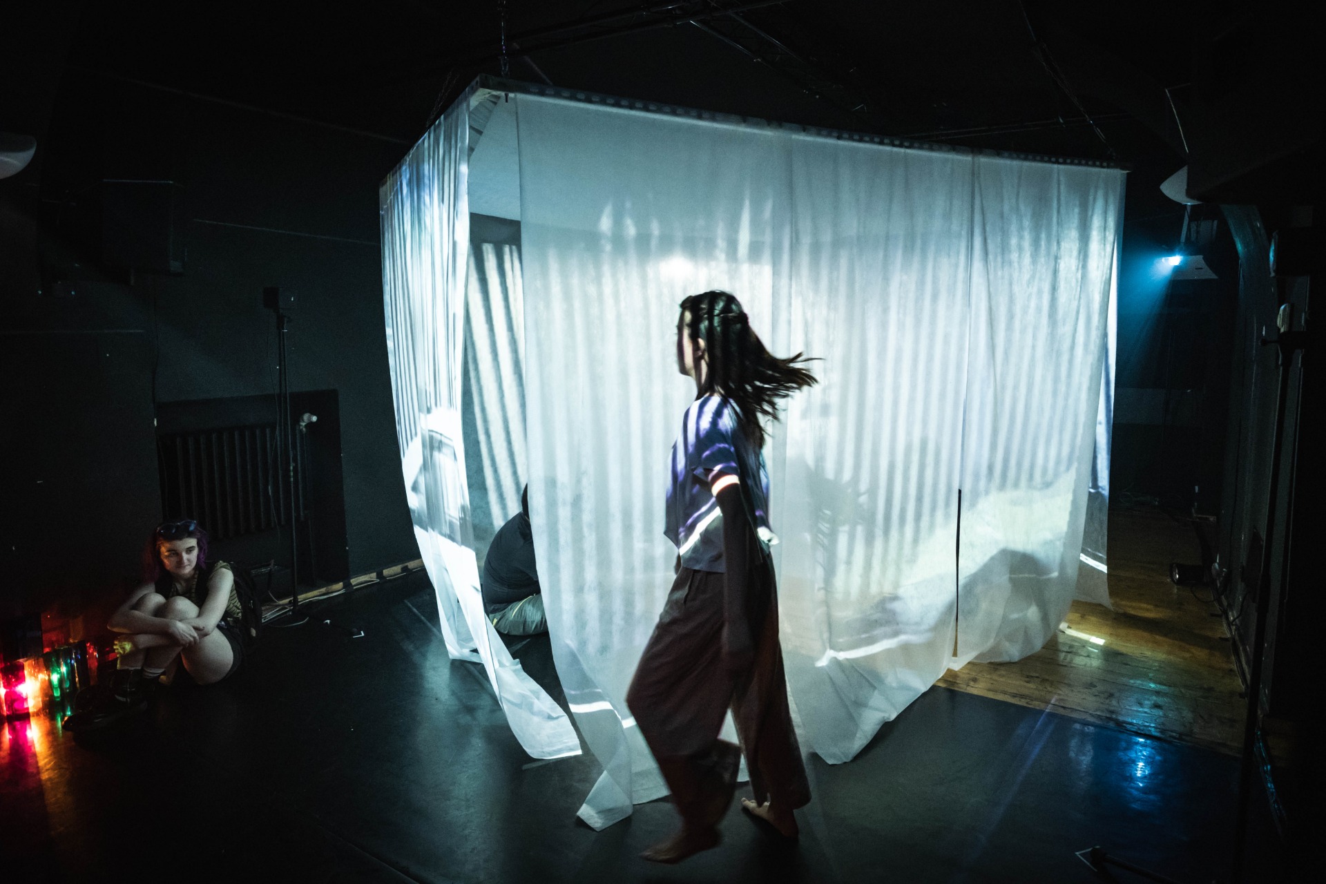 Prvních několik minut se neděje vůbec nic. Diváci rozestaveni po skupinkách v prostoru sledují bílé látky, které splývají z čtvercové konstrukce zavěšené vprostřed místnosti. Lahvičky s barevnou tekutinou a fólie rozestavené v rozích vrhají pod září reflektorů barevná prasátka a z reproduktorů se ozývá zvuk evokující psaní křídou na tabuli. Než se však jeden stačí ztišit, už přichází rychlé záblesky projekce na pruhy tkaniny. Auta, davy, mrakodrapy, hluk a mnoho tváří. Dvě performerky si rázným krokem klestí cestu. Nekompromisně naráží do druhých a s odhodlaným výrazem jdou za svým cílem. Každý z nás ten pocit zná - cestou do práce, v městské dopravě, v obchodě. Pulzování a shon velkoměsta jsou vyčerpávající. Najednou přichází další změna. Hudba se proměňuje v lehké tóny a přichází zastavení. Aktérky plují na zádech po podlaze a svým pohybem zpomalují tempo. Můžete si lehnout, nebo sednout a zaposlouchat se do hladivých zvuků. Nejasnost přesto zůstává přítomna po celou dobu, ani jednou není jasné, co přesně se od účastníka vyžaduje. Má jen nečinně sedět, nebo se má připojit k tvůrkyním a převalovat se po zemi? Látky jsou nakonec strženy, všichni jsme usazení do středu místnosti a každý v ruce drží jednu z barevných fólií/lahviček. Na chvíli prostoupí prostor kužely teplého světla z reflektorů na zemi a už je konec. A to je všechno?