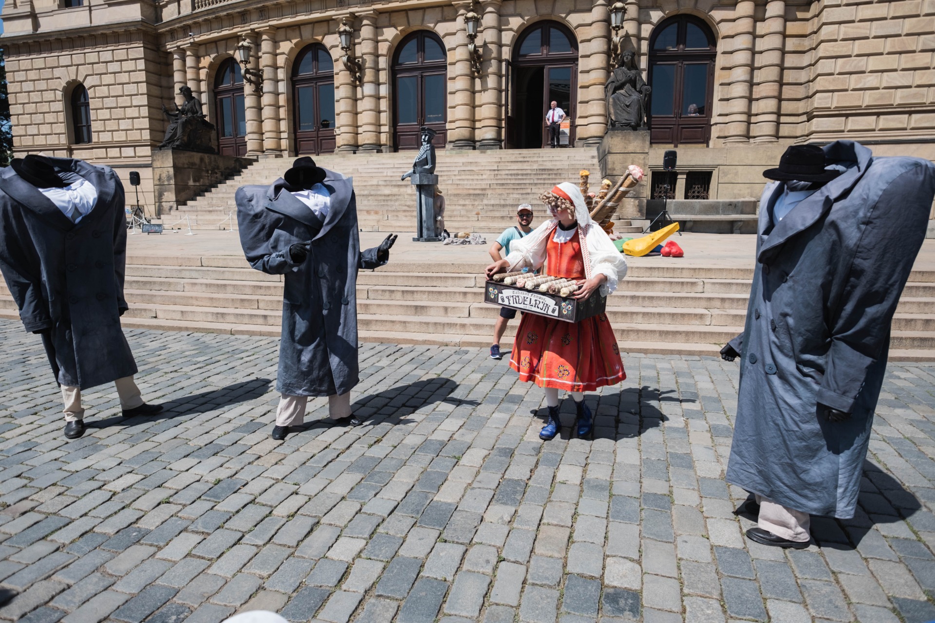 Na náměstí Jana Palacha, přímo na schodech před Rudolfinem, se k životu začaly probouzet sochy. S hudebně-loutkovým site-specific programem přijeli studenti z Royal Welsh College of Music and Drama z Walesu.