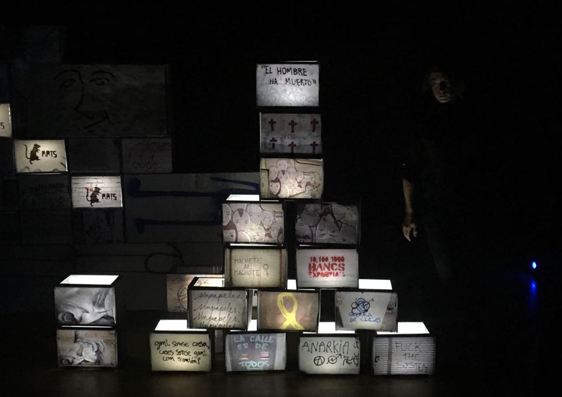 The scene consists of a tall, wide wall made out of small and large boxes. Each box is covered in photos of real graffiti. When the lights go out, two performers light up individual pictures, either with flashlights or with LED used inside the boxes, making them visible to the audience. The story begins, walls come alive and talk.